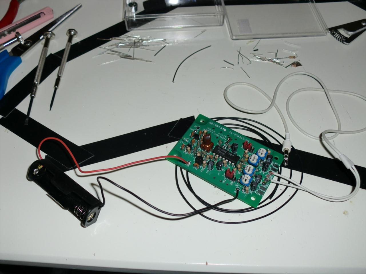 ミニプラグは壊れたイヤホンを分断して流用。付属の電池ボックスは使い辛かったのでストックの電池ボックスを利用。
