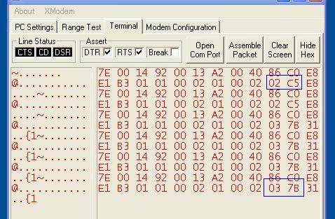 コーディネータ側の(以後XbeeC)でデータを受信し、X-CTUのターミナル機能を使ってデータログを参照し、電圧と送信されたデータが対応しているかを確認する。
