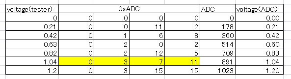 ↑受信データを電圧に換算した表。0.1V程度までは完全に一致するので電子工作には十分の精度である。そこから先の精度は知らんw(多分けっこうな高精度だとおもわれ)