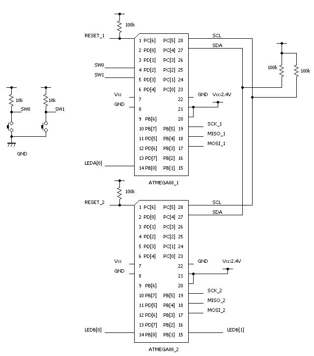 で。配線をすっきりさせて制作の効率をよくするために装置の中心になるAVRマイコンを2つに増やし、2線シリアル通信することで、仕事と配線を2つに分けることを提案。