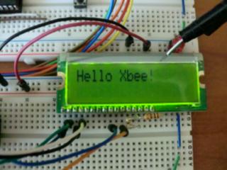 (3)実験(2)と同様の回路を使って「Hello Xbee!」の文字をLCDに表示する。